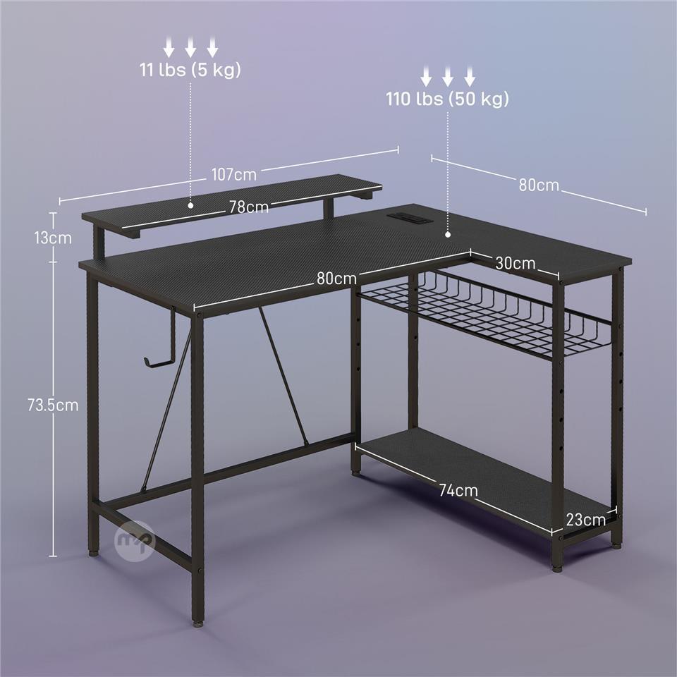 Reversible Corner Desk with LED, Power and USB Sockets, Shelves and Monitor Stand, Black