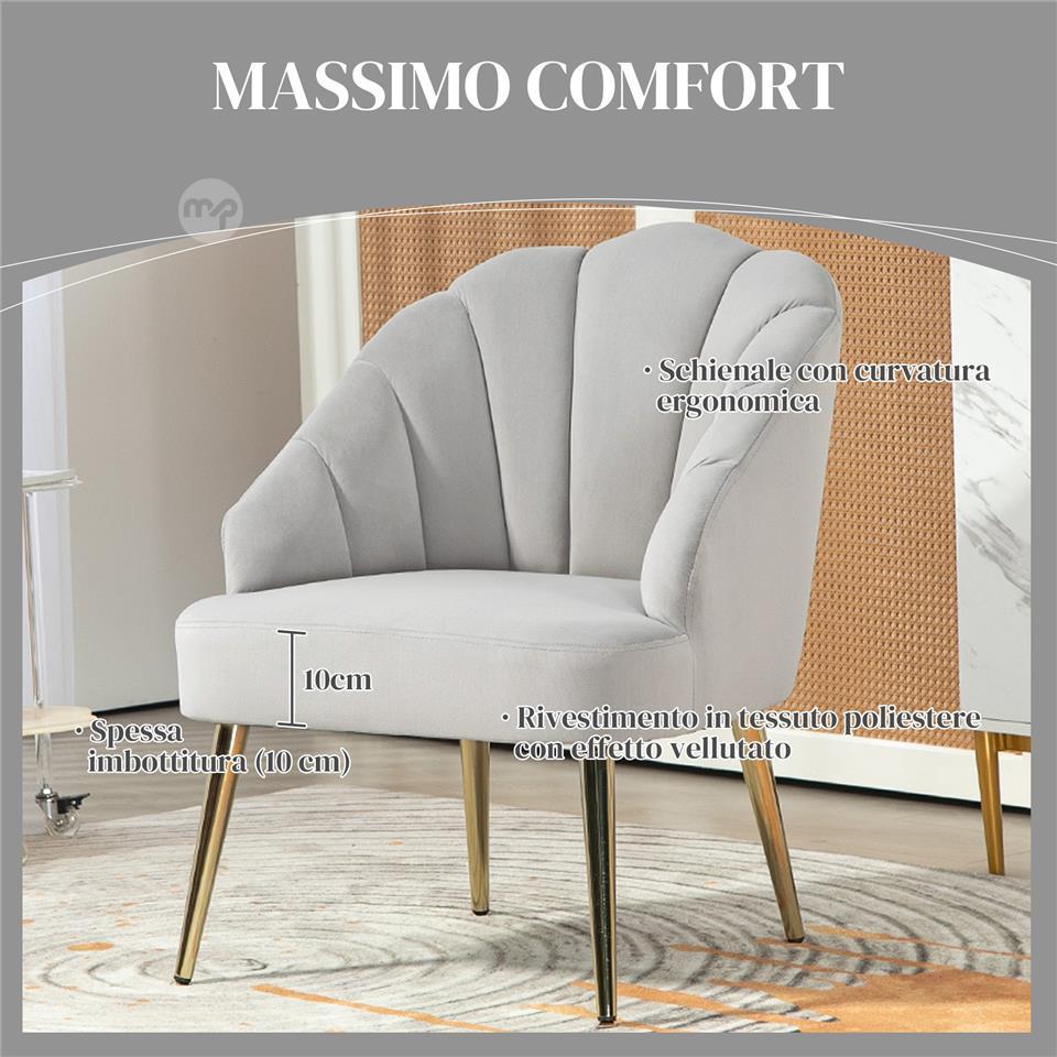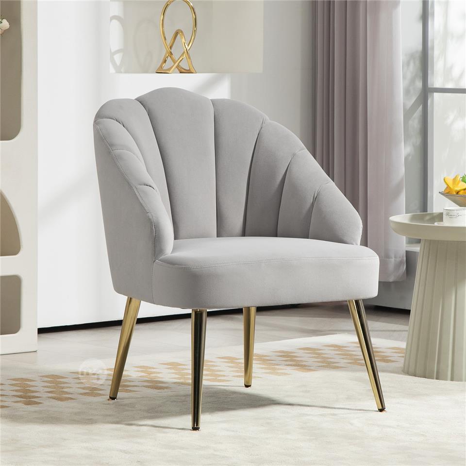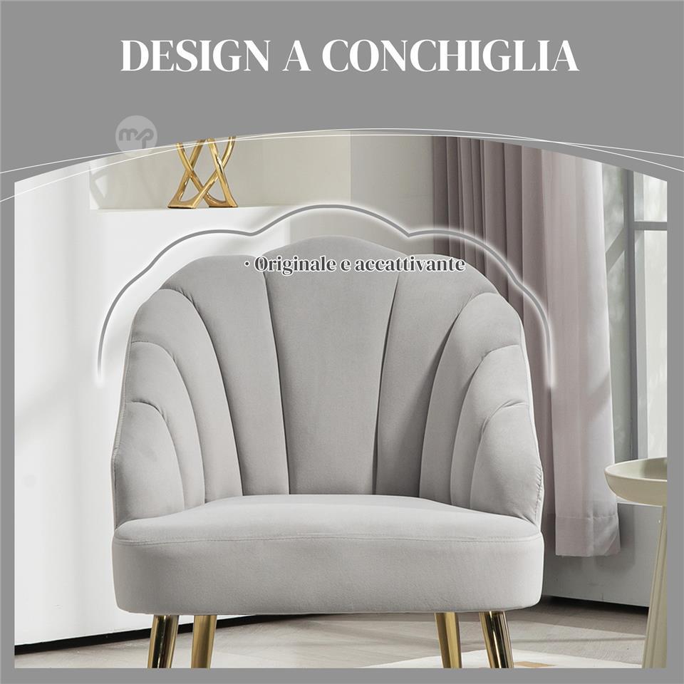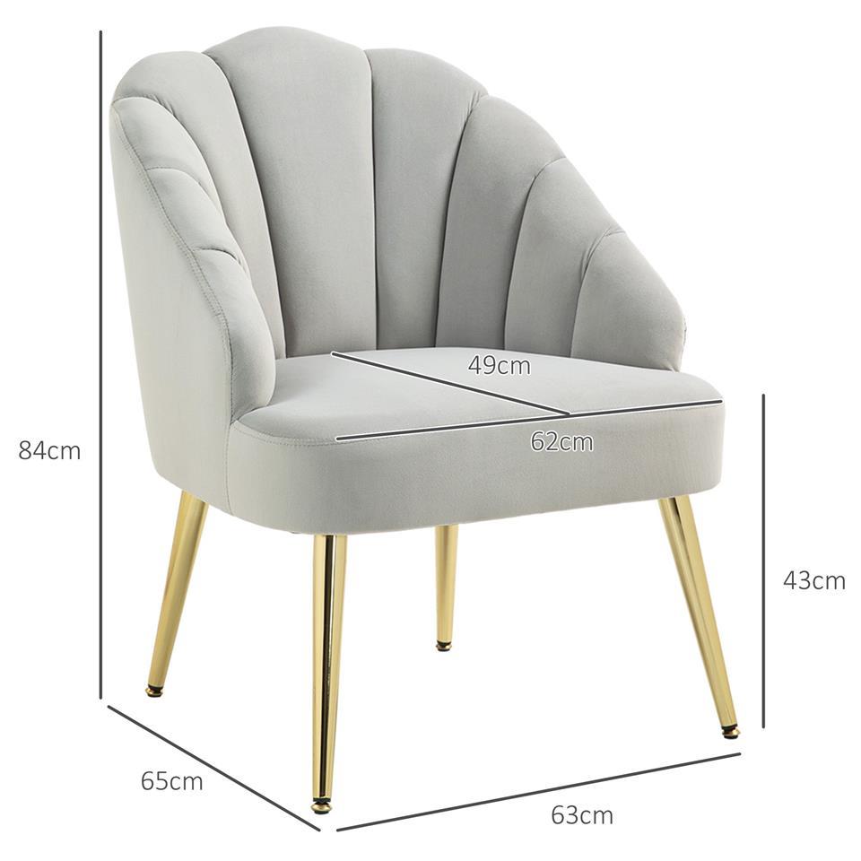 Art Deco Style Shell Living Room Armchair, Velvet and Steel, 63x65x84 cm, Grey