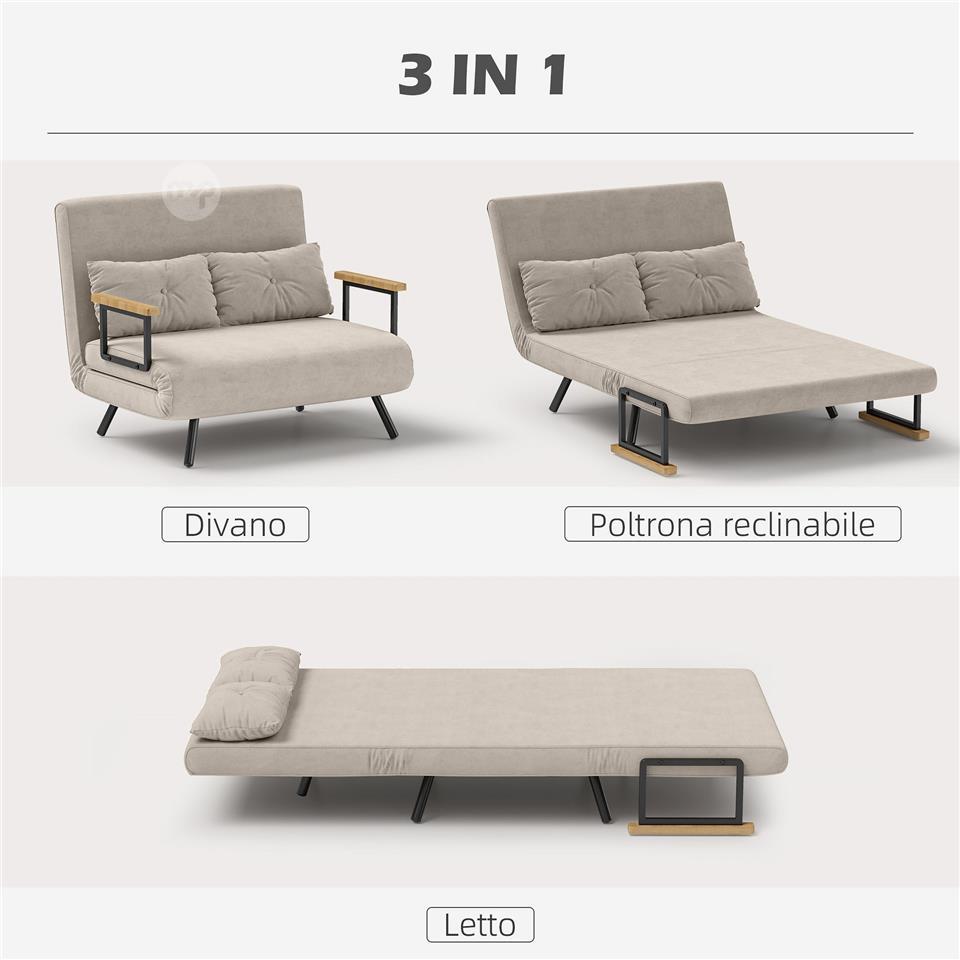 Velvet Fabric Sofa Bed 3 in 1 with Adjustable Backrest and 2 Cushions, 102x73x81 cm, Cream White