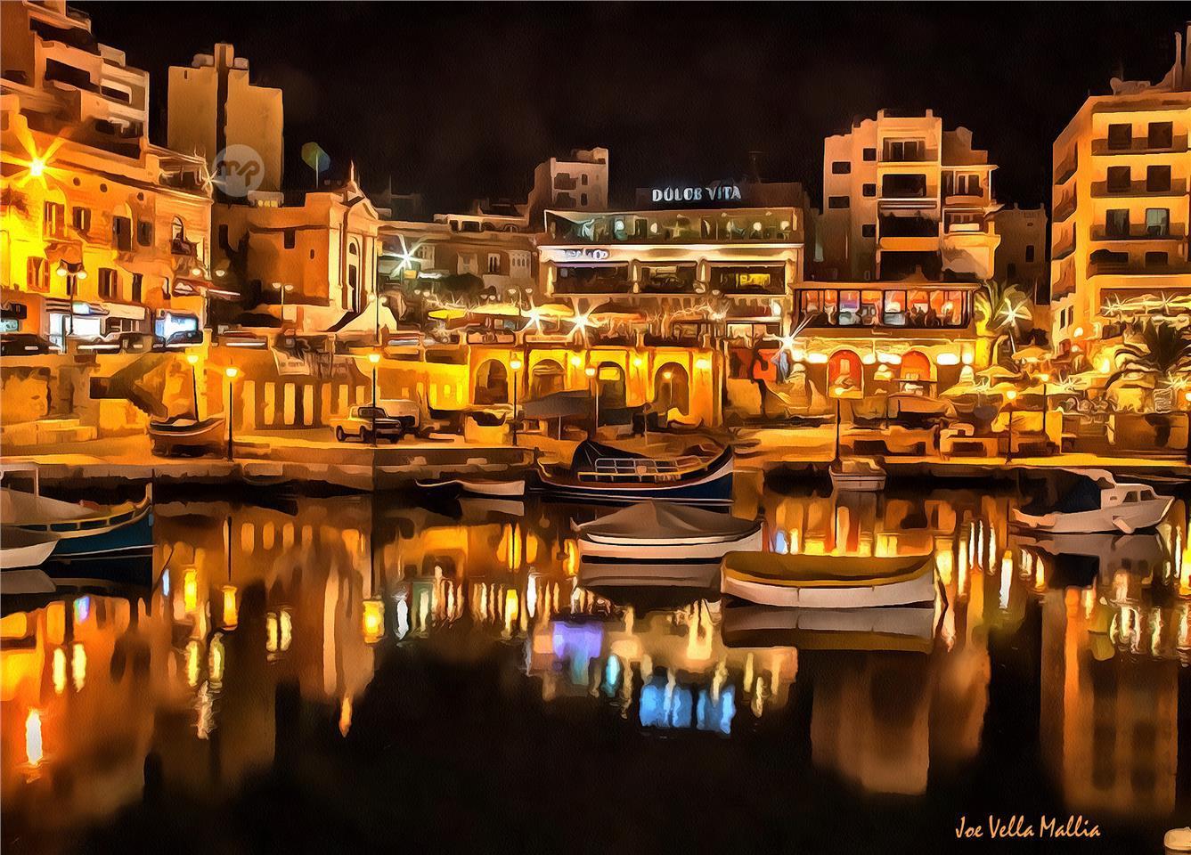 NIGHT AT ST JULIANS MALTA ---- ORIGINAL HAND PAINTING OIL ON CANVAS 70X50
