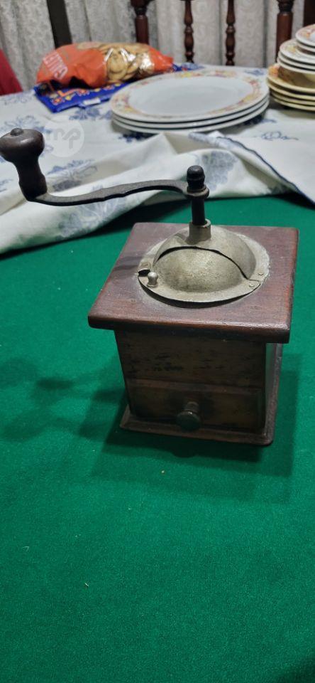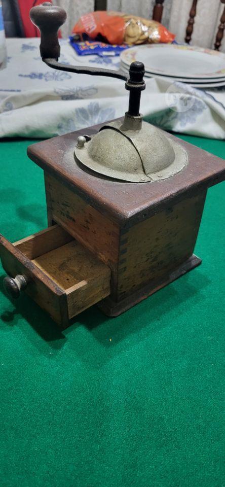 This is a vintage/antique manual coffee grinder with a wooden box and metal top.