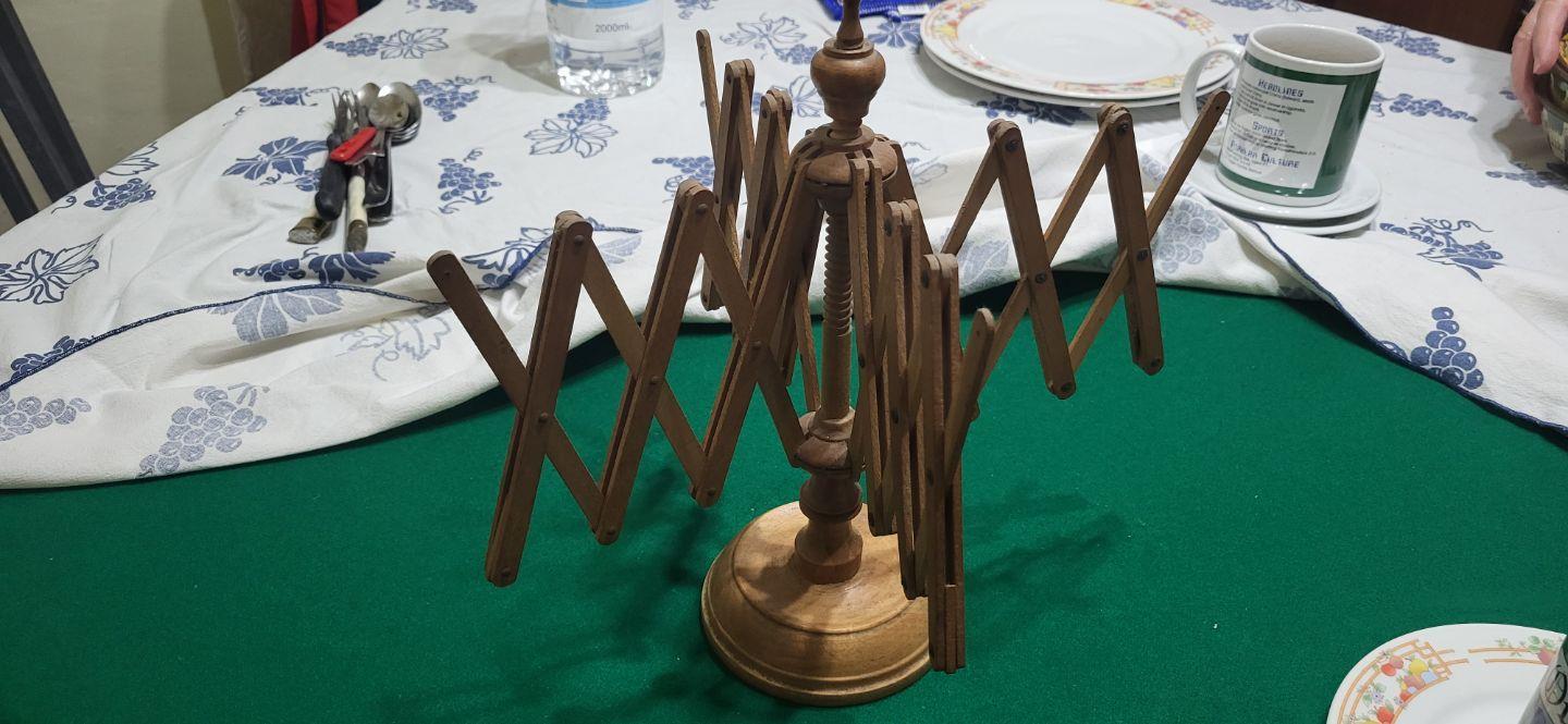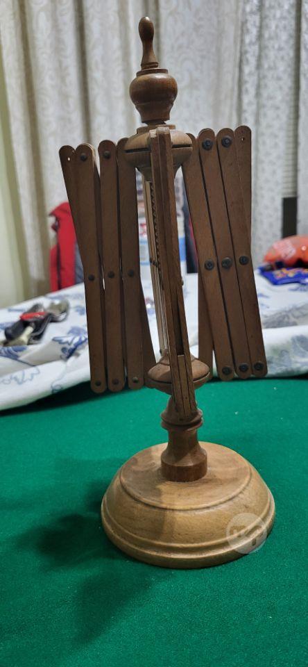 This is a vintage or antique wooden yarn swift, also known as an umbrella swift or yarn winder. It is a tool used by knitters and crocheters to hold a skein or hank of yarn and rotate as the yarn is wound into a ball.