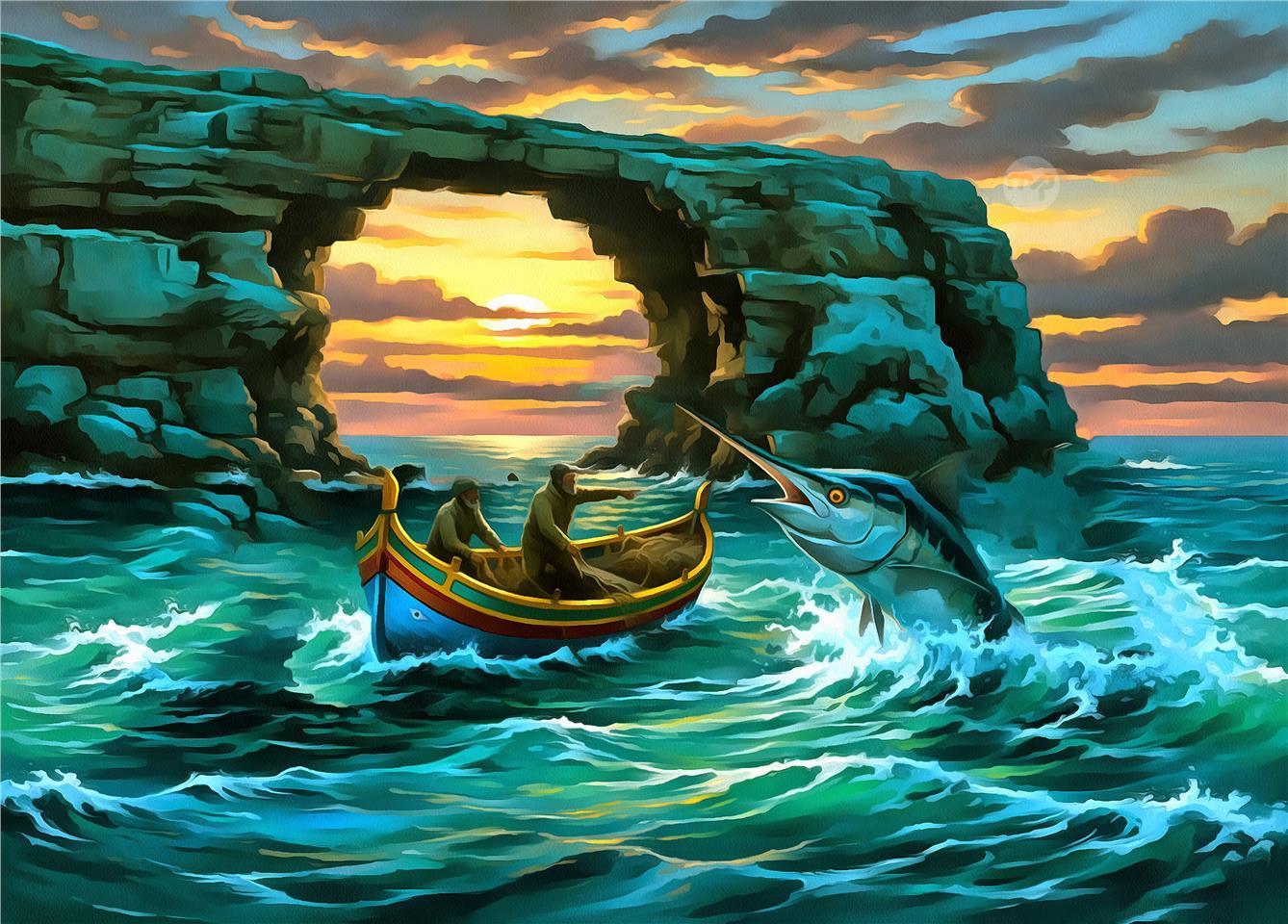 (this is a true event happened IN 1963 known as THE SWORDFISH ATTACK near the Azure window Gozo) ORIGINAL, REALISTIC ART. 100% HAND PAINTED OIL ON CANVAS. SIZE 70cm x 50cm.