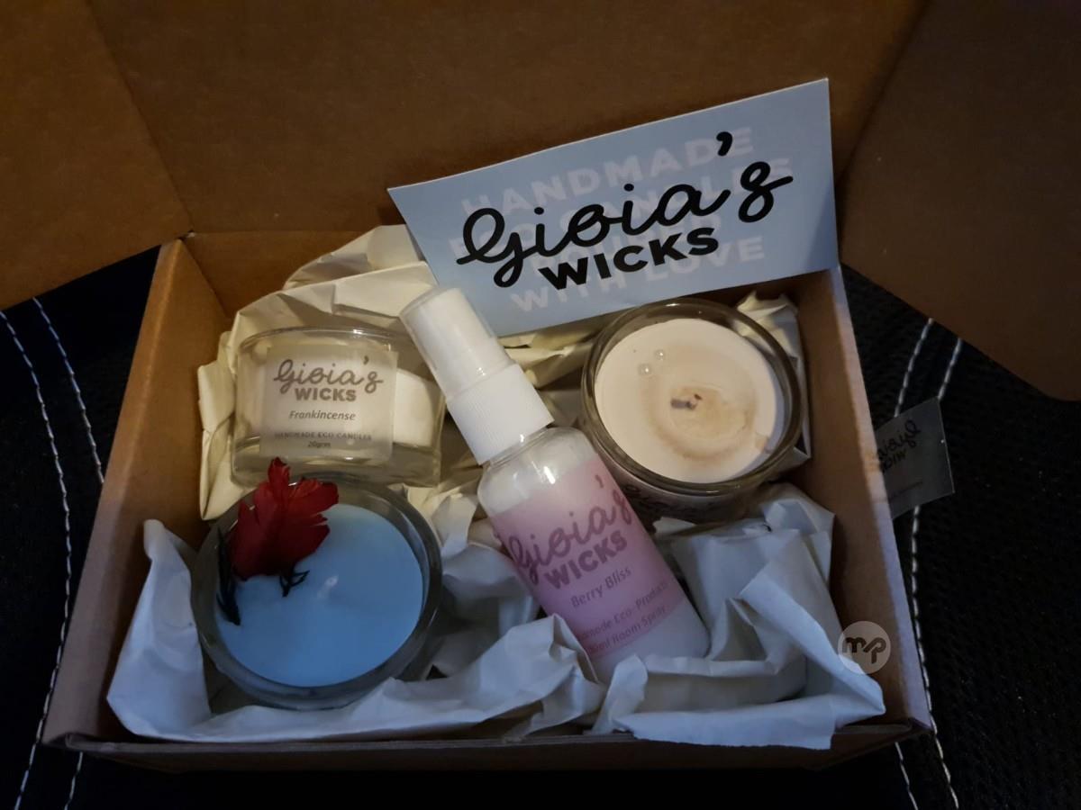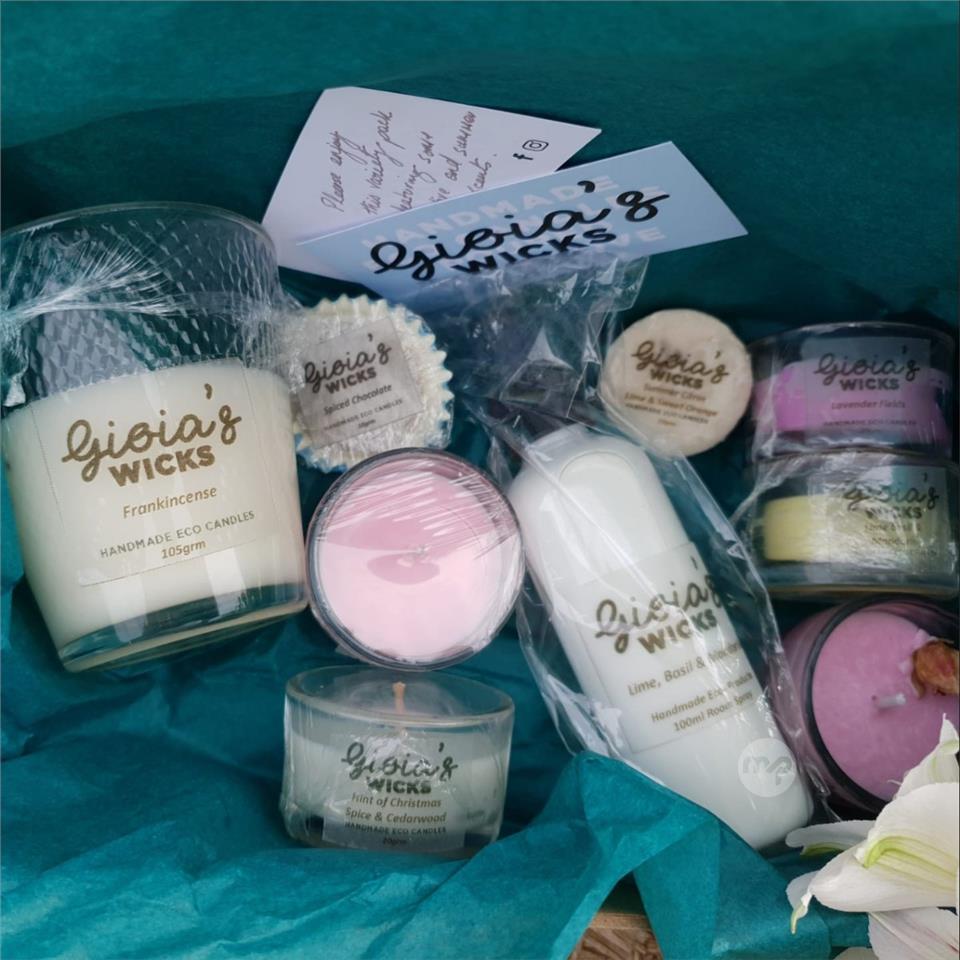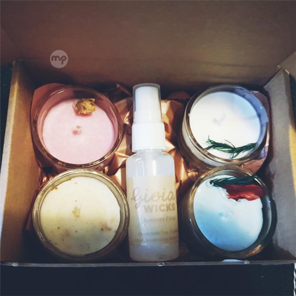 Gift boxes with hand poured, eco- soy scented candles and other products