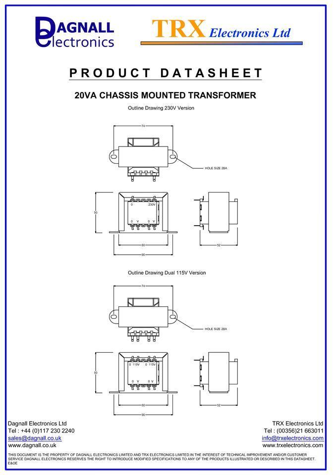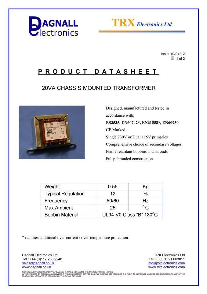 Dagnall Chassis Mount Transformer, Chassis, Safety Isolating, 230V, 2 x 15V, 20 VA, 50Hz / 60Hz