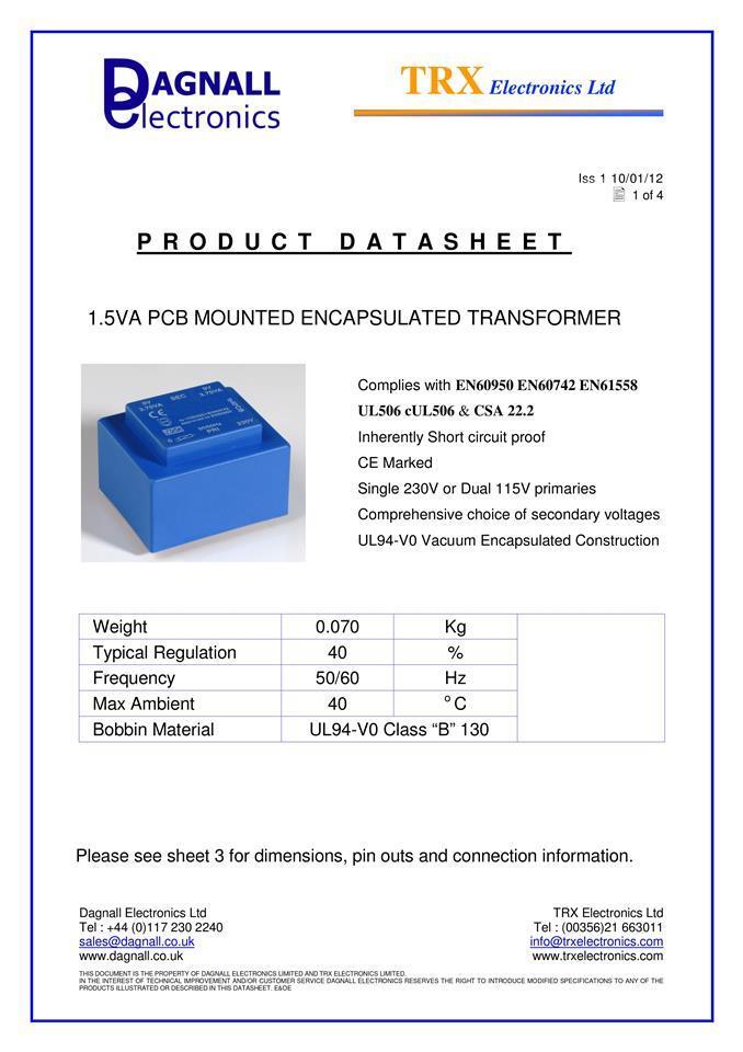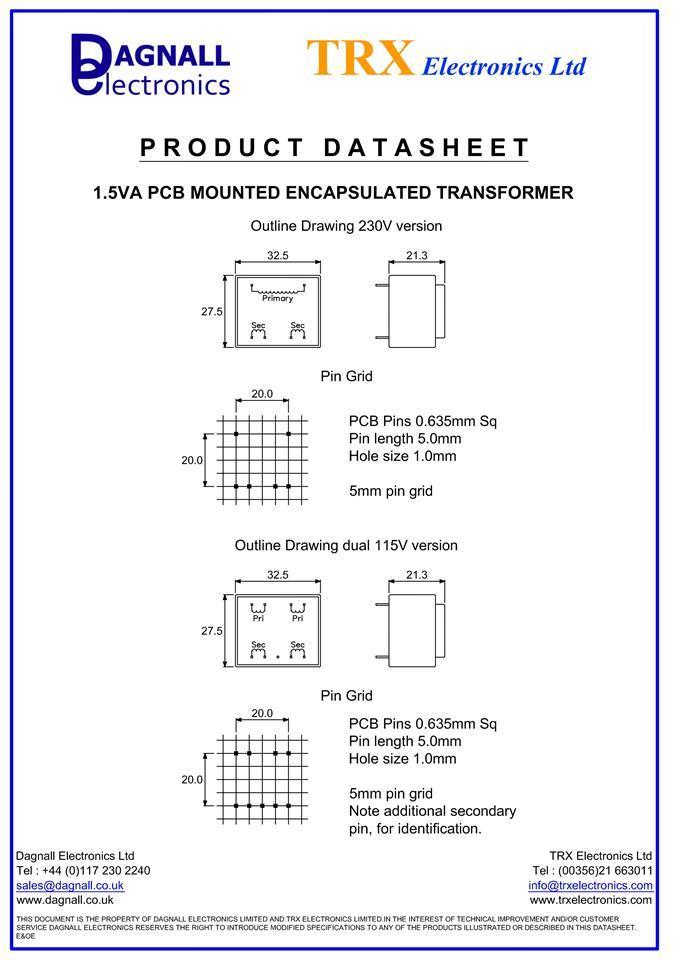 Dagnall 1 x Block VB 1.5/2/9, 9V ac 2 Output PCB Transformer, 1.5VA, 230VAC