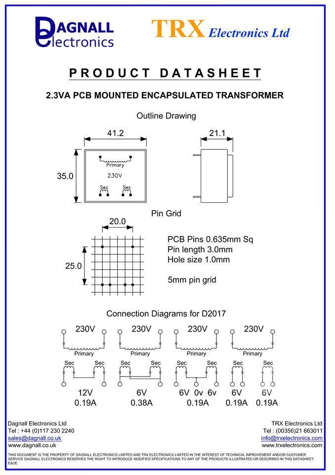 Dagnall 1 x Block VB 2.3/2/6, 6V ac 2 Output PCB Transformer, 2.3VA, 230VAC