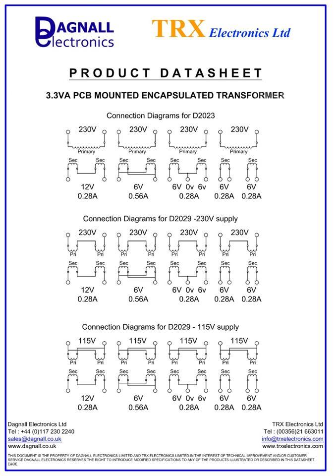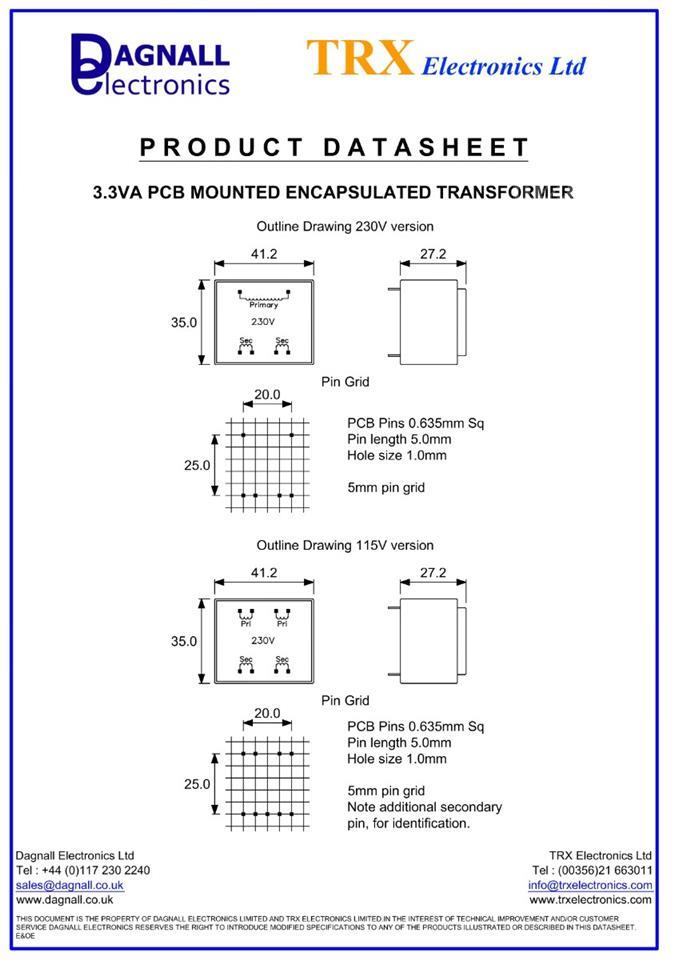Dagnall 1 x Block VB 3.3/2/6, 6V ac 2 Output PCB Transformer, 3.3VA, 230VAC