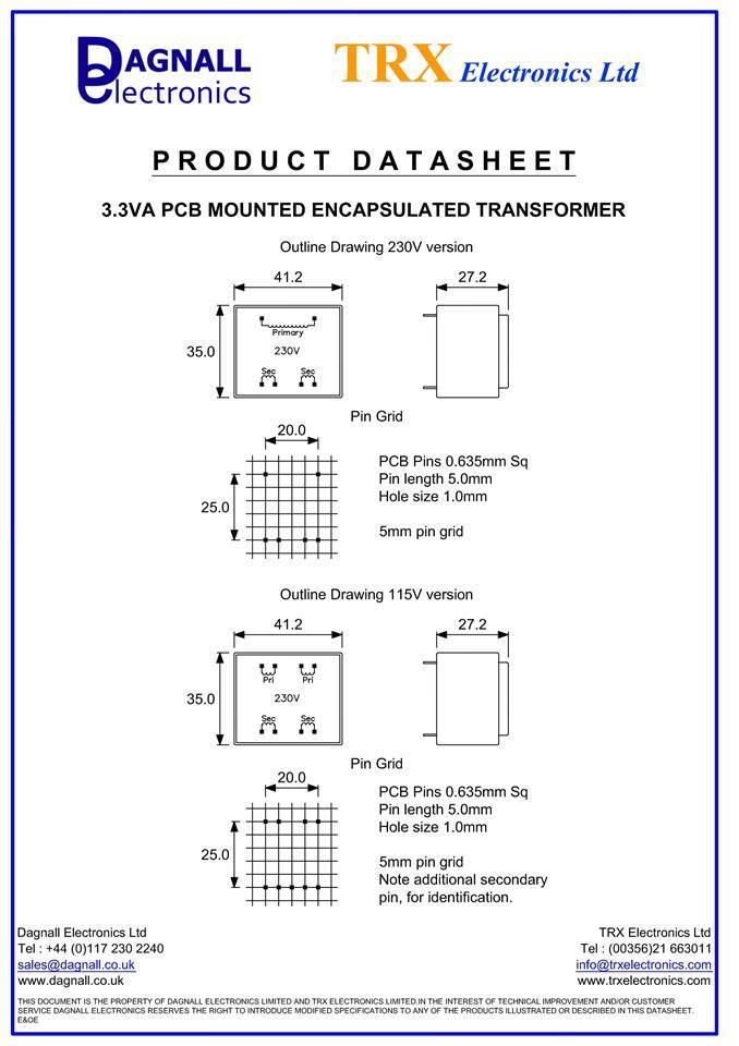Dagnall 1 x Block VB 3.3/2/8, 8V ac 2 Output PCB Transformer, 3.3VA, 230VAC