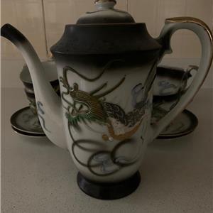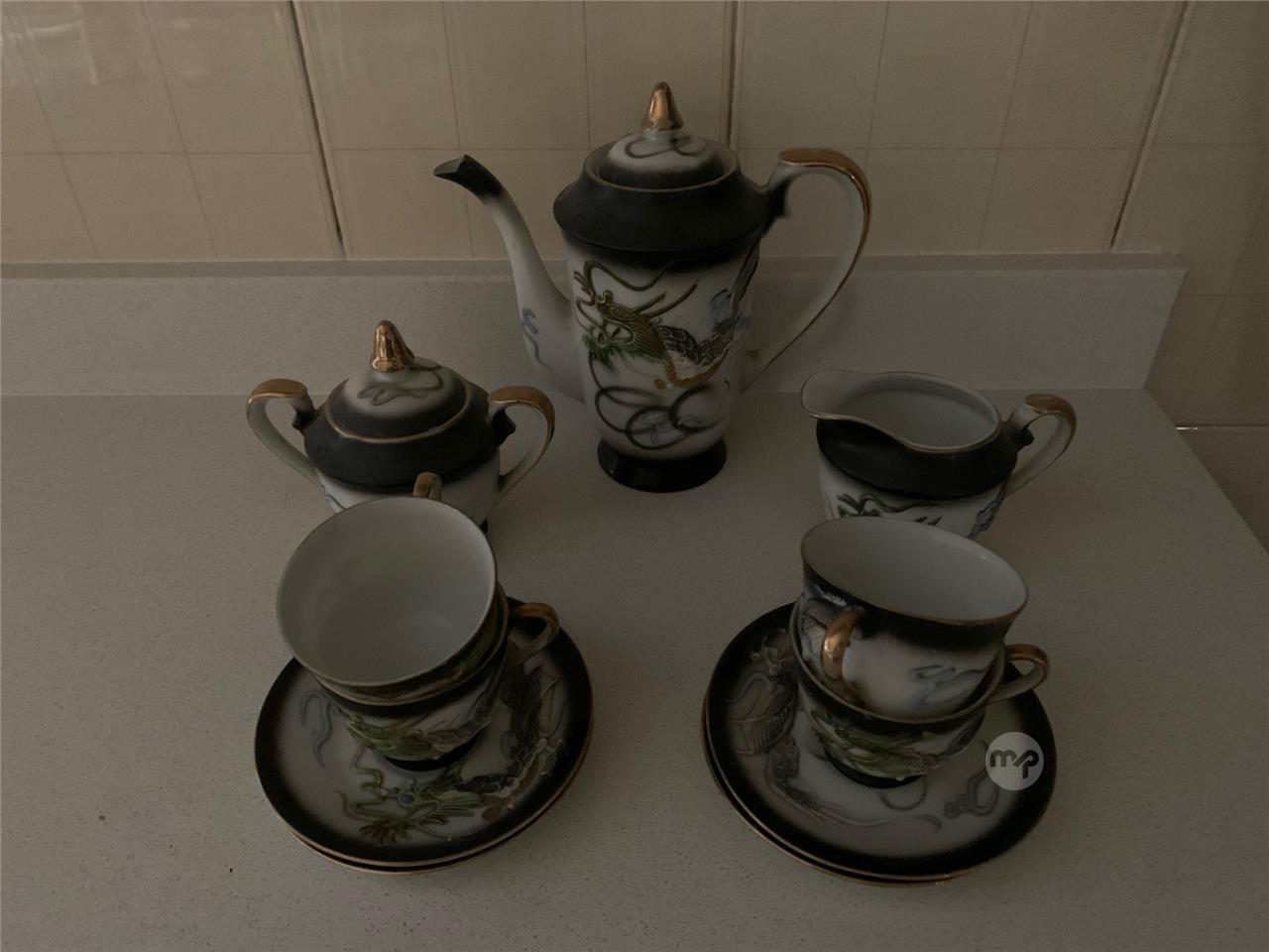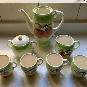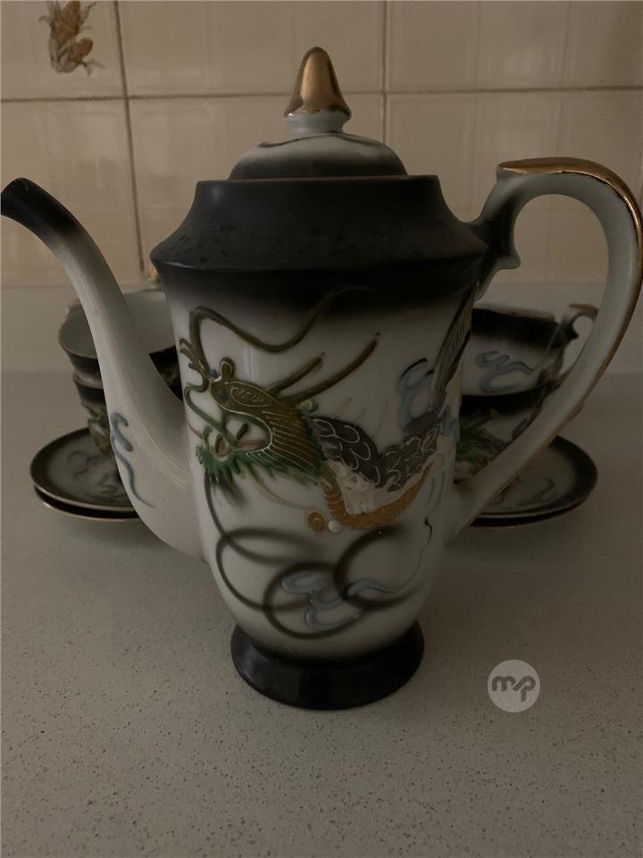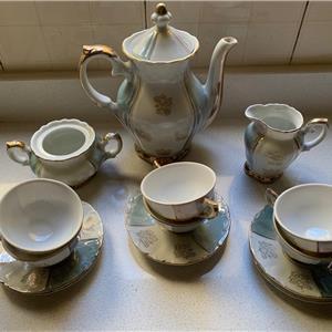 Consisting of a teapot , milk and sugar container , 4 cups and 4 saucers