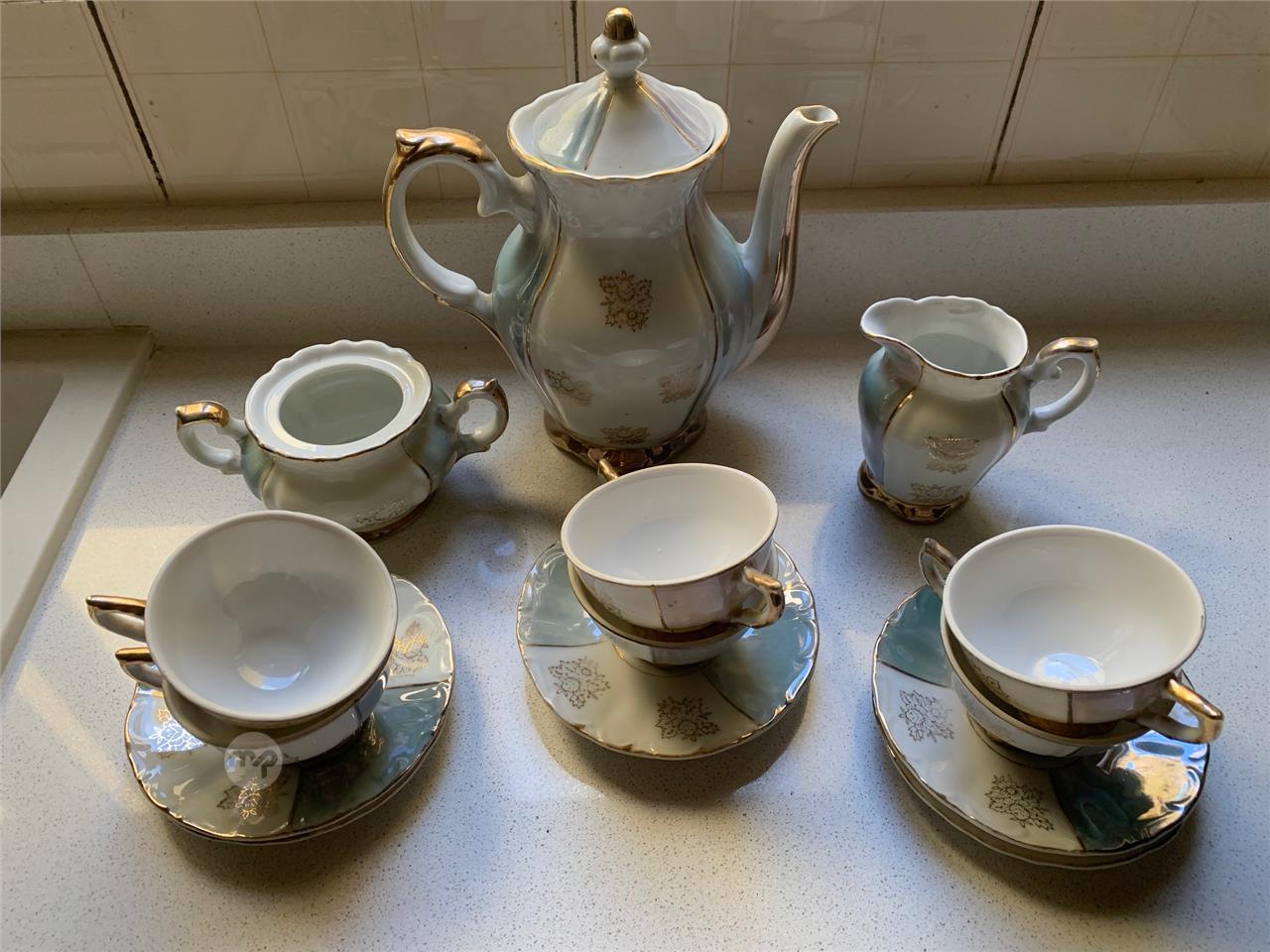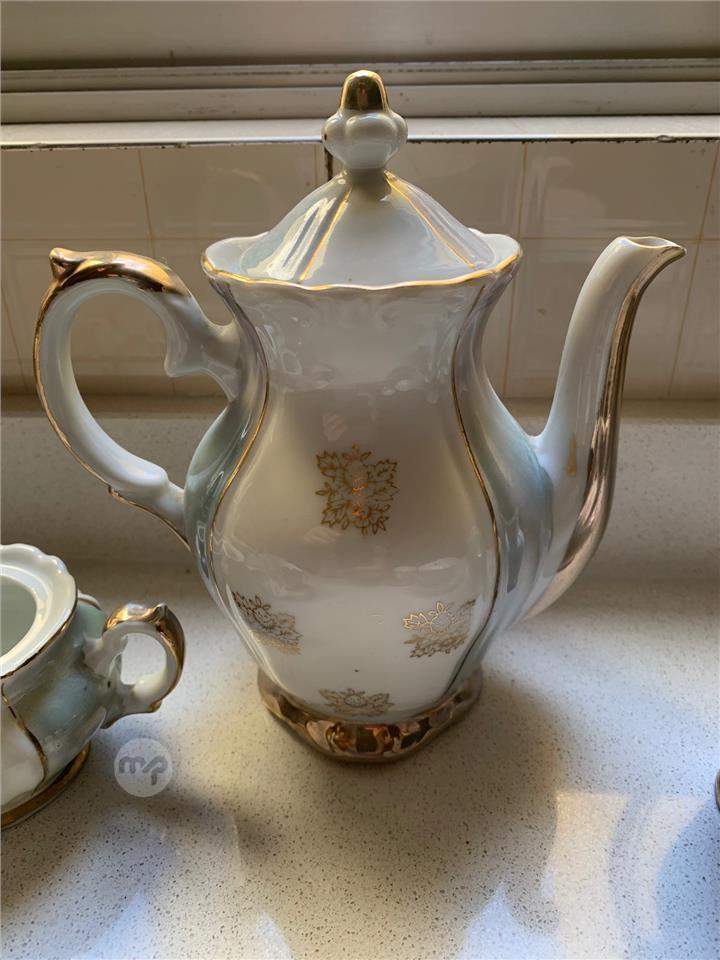 Consising of a large teapot or coffee pot ,milk and sugar container , 6 cups and 6 saucers