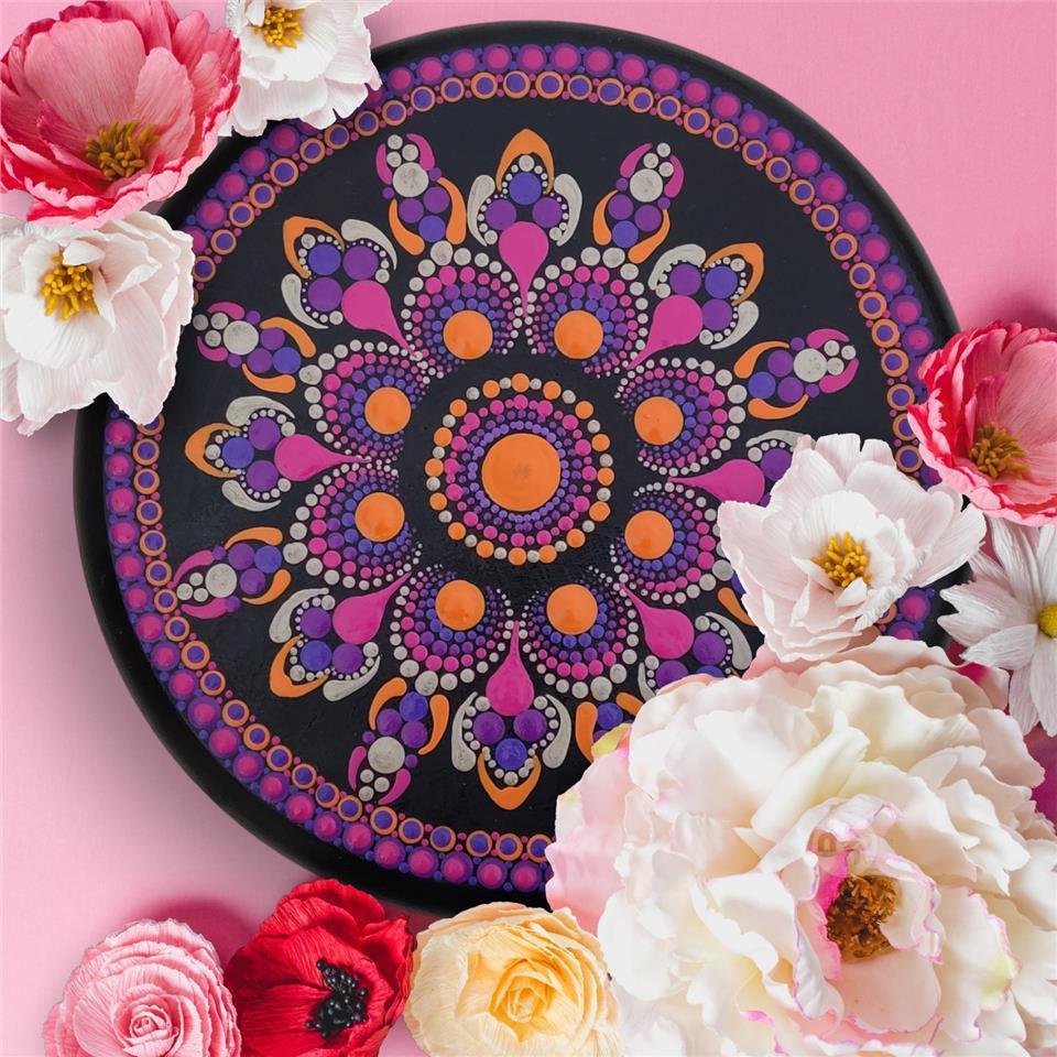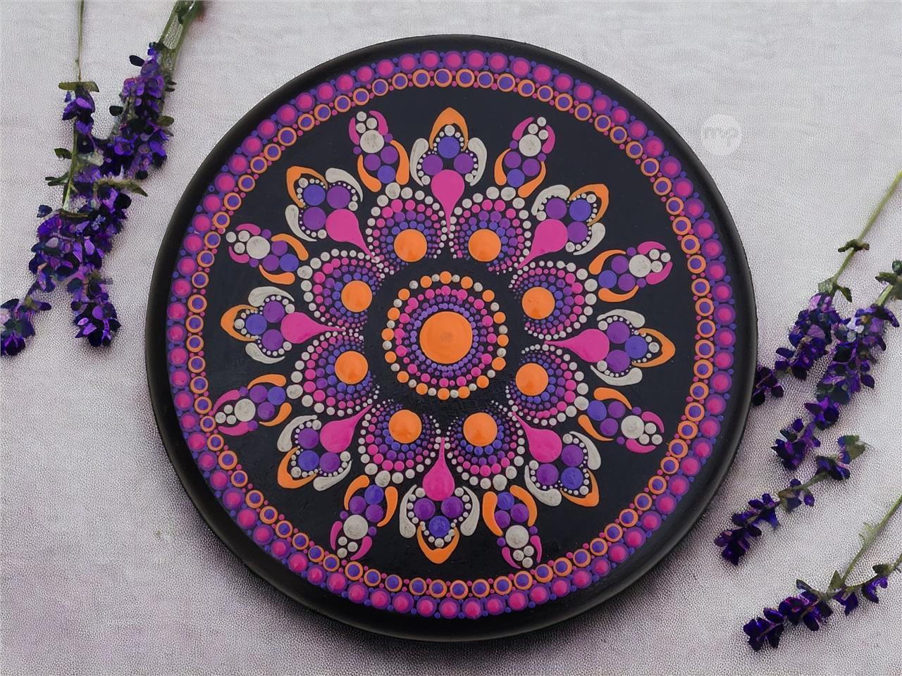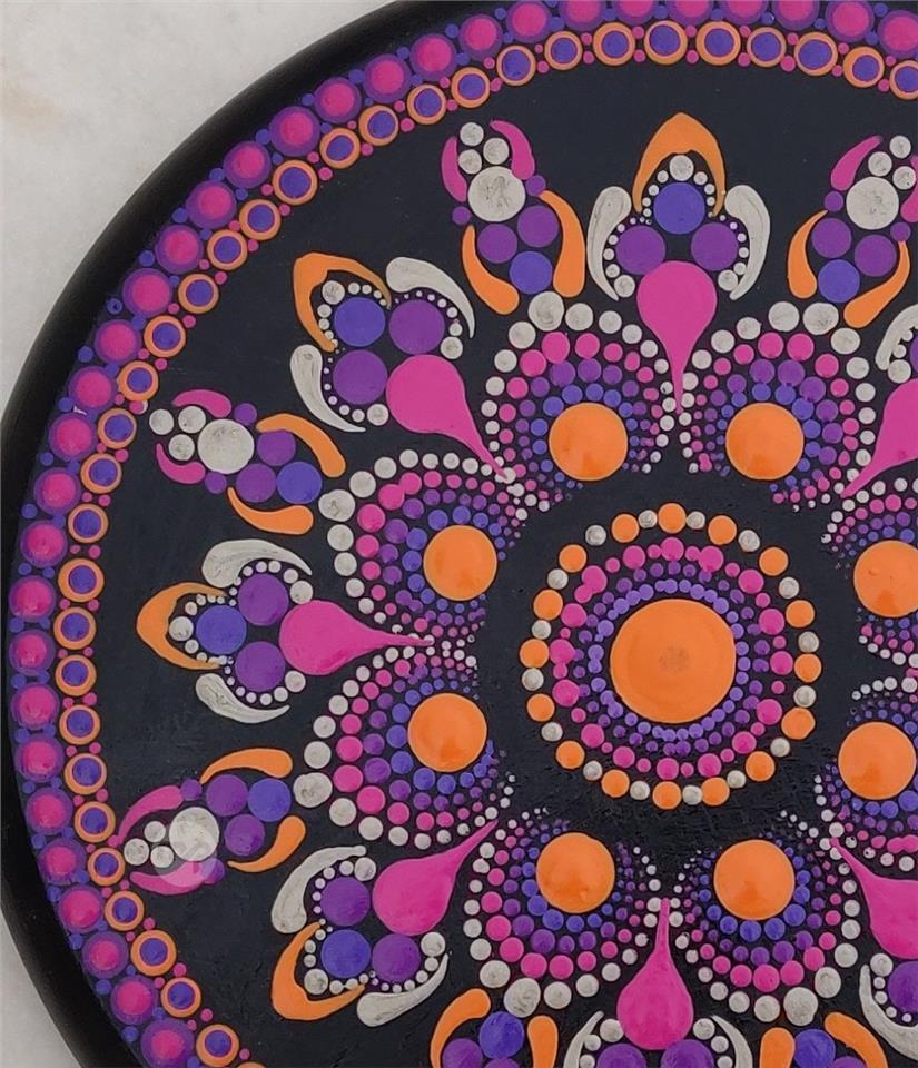 Hand painted wooden mandala in orange, pink, purple and metallic grey.