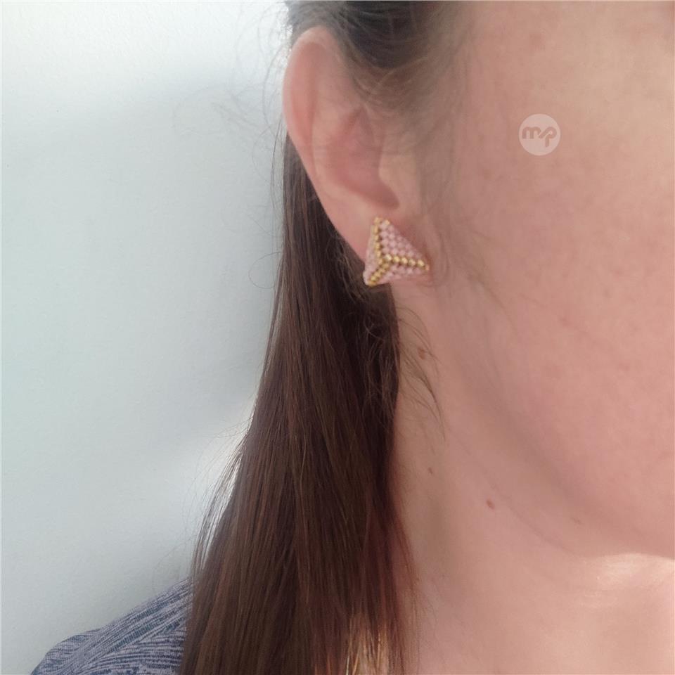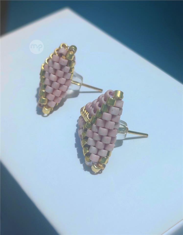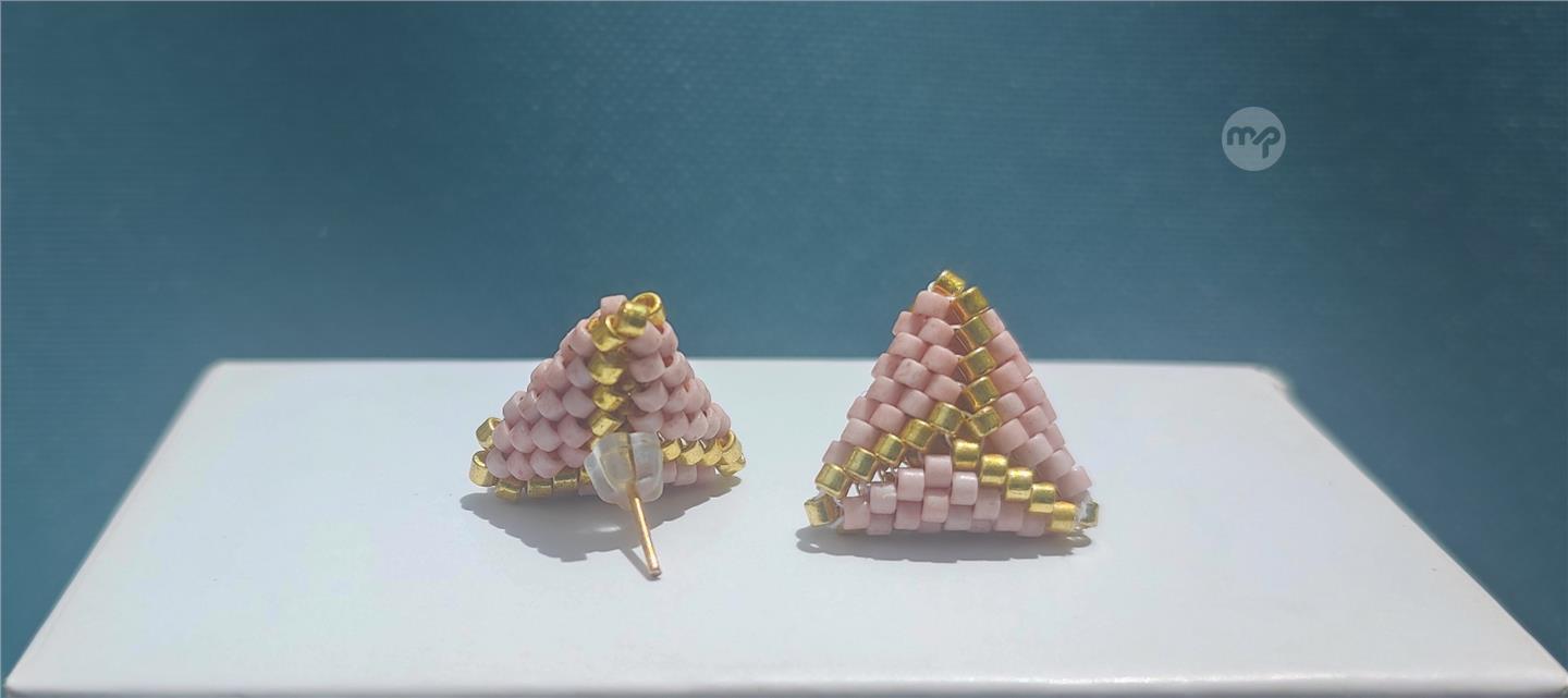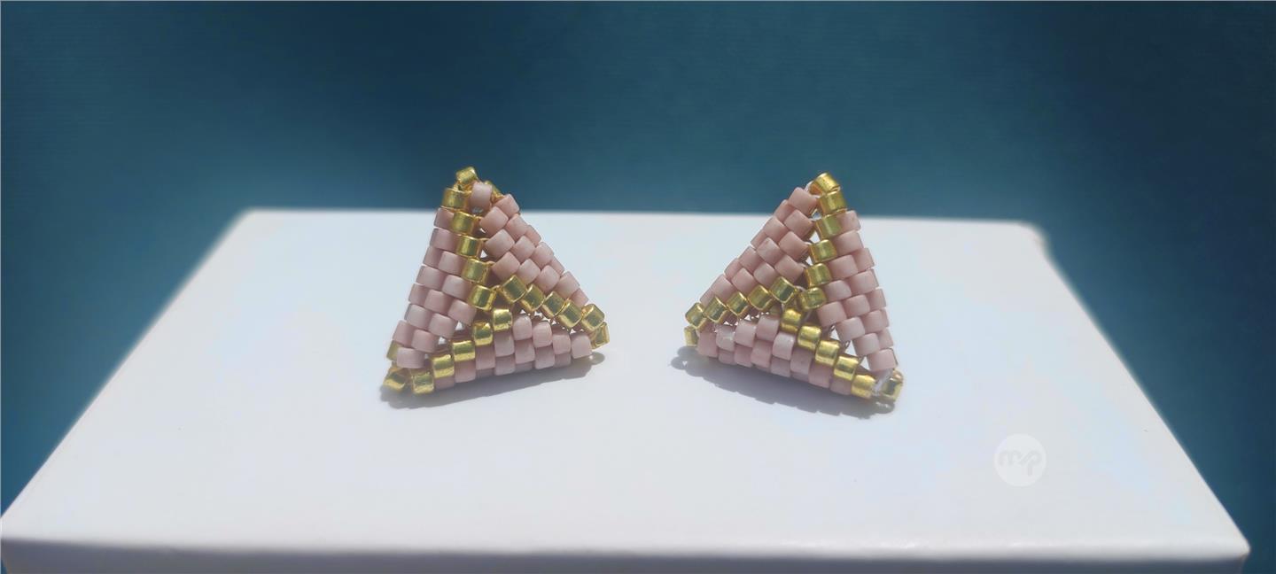 "Discover your charm with our Handcrafted Golden and Rose Pink Miyuki Triangle Earrings, designed to harness the magnetic allure of pink. Each meticulously crafted earring, stone by stone, radiates artisanal excellence and exquisite beauty. These 3D triangular wonders, measuring just one centimeter, evoke a sense of timeless elegance and romance, doubling as a talisman for attraction. Elevate your style and captivate hearts with these enchanting earrings. Explore our collection today and embrace the allure of handmade craftsmanship."