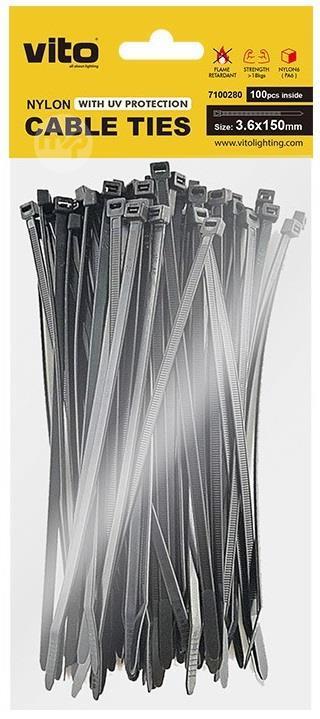 VITO PLASTICK cable ties made of NYLON6 (PA6) are BLACK in color with UV protection and tensile test of 18kg. There are 100 pieces in the package. The size of a tie is 3.6X150 mm.