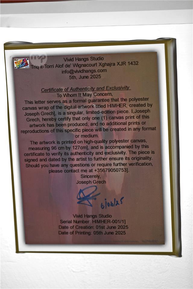 A unique guaranteed with certificate, only one exists like it. 96cmX127cm Large Format canvas wrap read to hang. Vivid pastel colours creation. Viewing at Vivid Hangs Studio Xghajra.