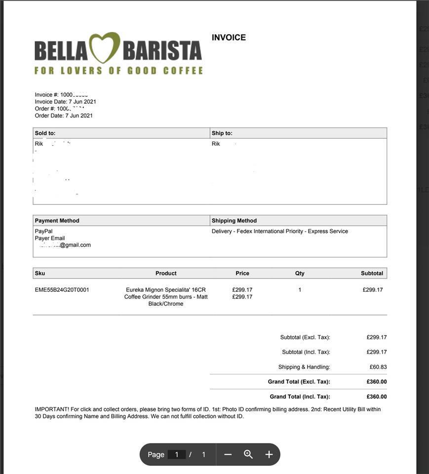 Bought in 2021 online from Bella Barista (invoice attached).
