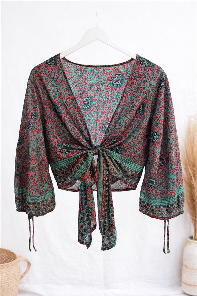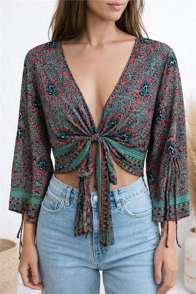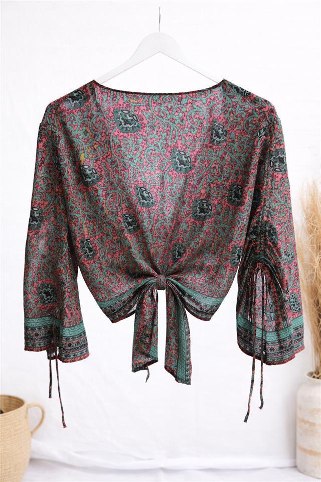 Beautiful boho-style blouse with a vibrant paisley pattern in shades of green, turquoise and pink.