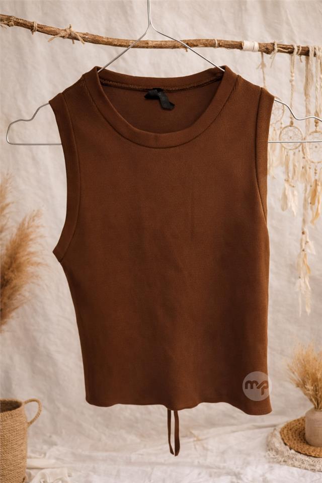 Stylish brown sleeveless ribbed top with a minimalist front and an eye-catching open back detail finished with adjustable tie strings. The classic round neckline and clean cut make it a versatile piece, while the open back adds a modern, feminine touch.